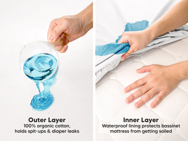 KeaBabies Soothe Protect+ Waterproof Bassinet Sheets quietly protect bassinet mattress from leaks and spills. Sized 33"x17"x4" to universally fit oval, hourglass, rectangle mattresses, and stay snug with elastic bands for a safe and soothing bedtime.