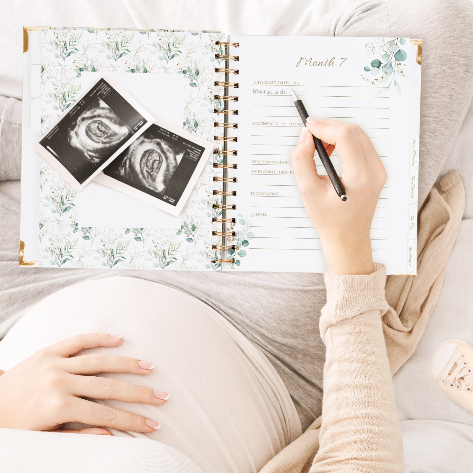 - 90 pages hardcover, 7.8x9" ring-bound pregnancy journal