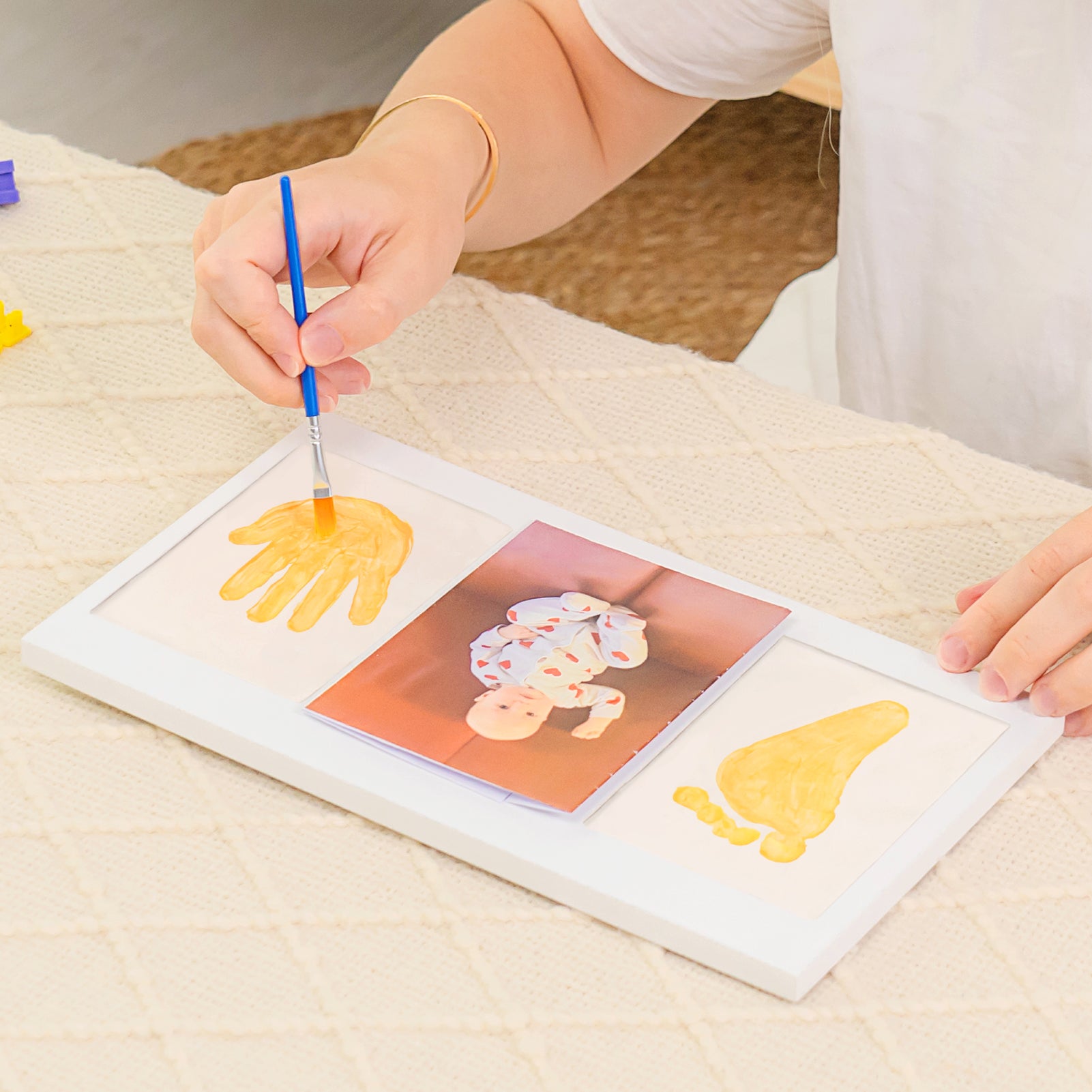 • Personalized photo frame with acrylic paint, paint brush, and name/date printing kit