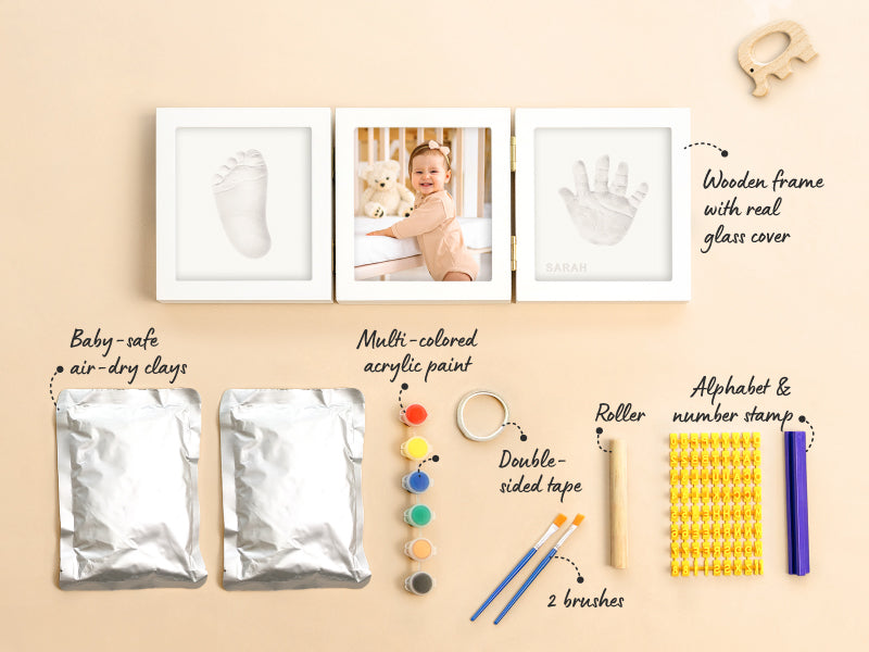 We’ve thought of it all! A tri-fold Fond wooden frame with glass, baby-safe air-dry clay, alphabet stamps for a personal touch, a wooden roller for smooth crafting, paint and brush for finishing touches, and double-sided tape to keep it all in place. Simple, fun, and ready to get crafty.