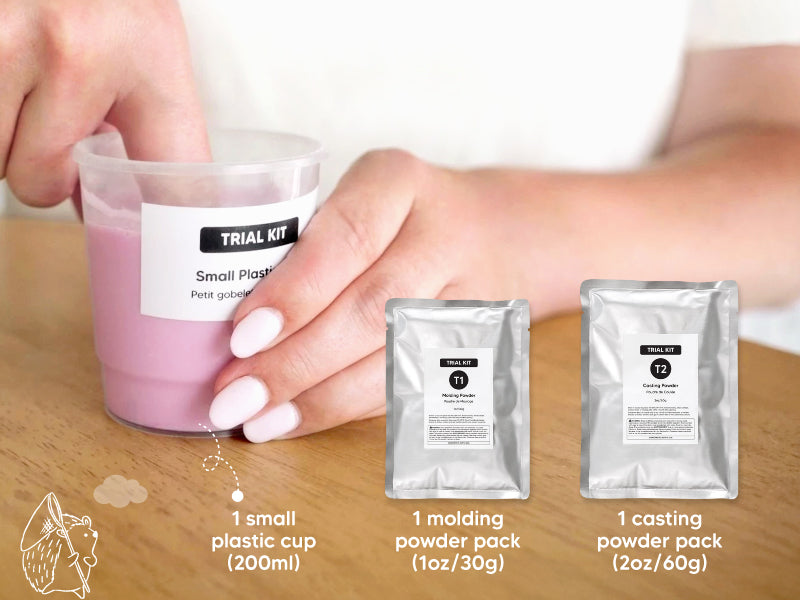 - All-in-1 molding kit: trial kit, tools, paints, and stylish wood base for 2 castings.