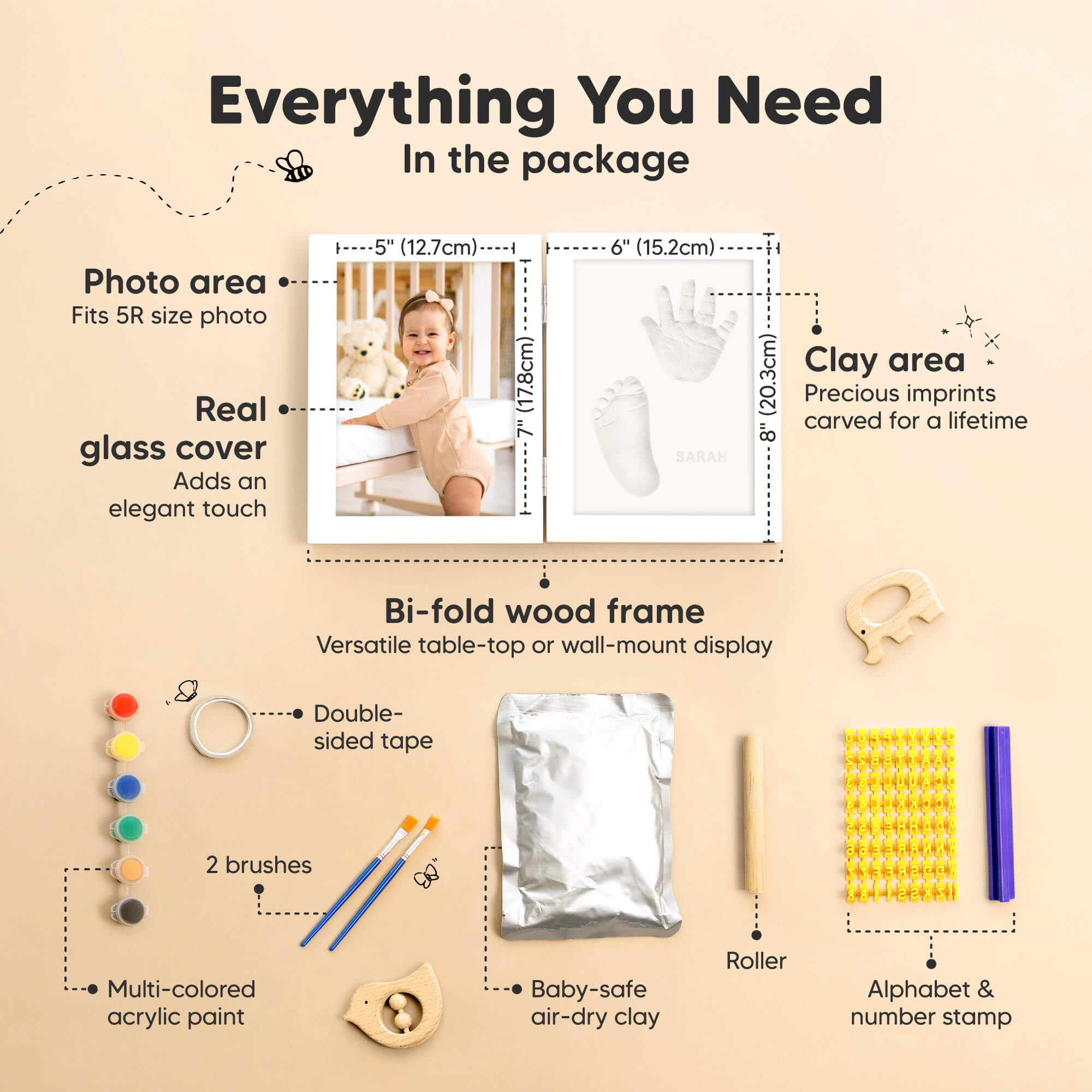 We’ve thought of it all! A bi-fold Rune wooden frame with glass, baby-safe air-dry clay, alphabet stamps for a personal touch, a wooden roller for smooth crafting, paint and brush for finishing touches, and double-sided tape to keep it all in place. Simple, fun, and ready to get crafty.