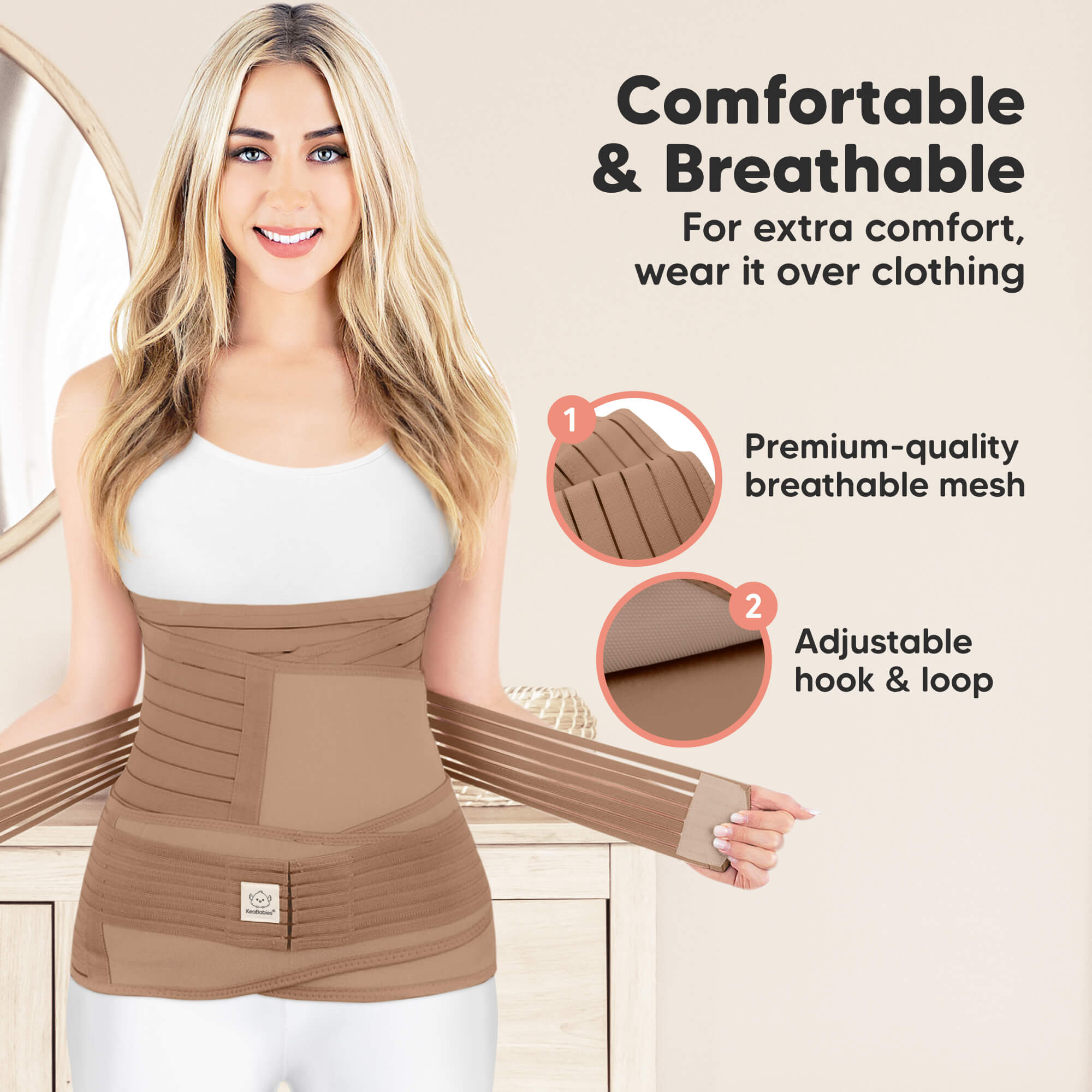 Wear the Stomach Belt, followed by the Waist Belt to provide the much-needed lumbar support during breastfeeding and relieve back pain. If you are recovering from diastasis recti, the use of two belts also helps close the gaps between your abdominal muscles.