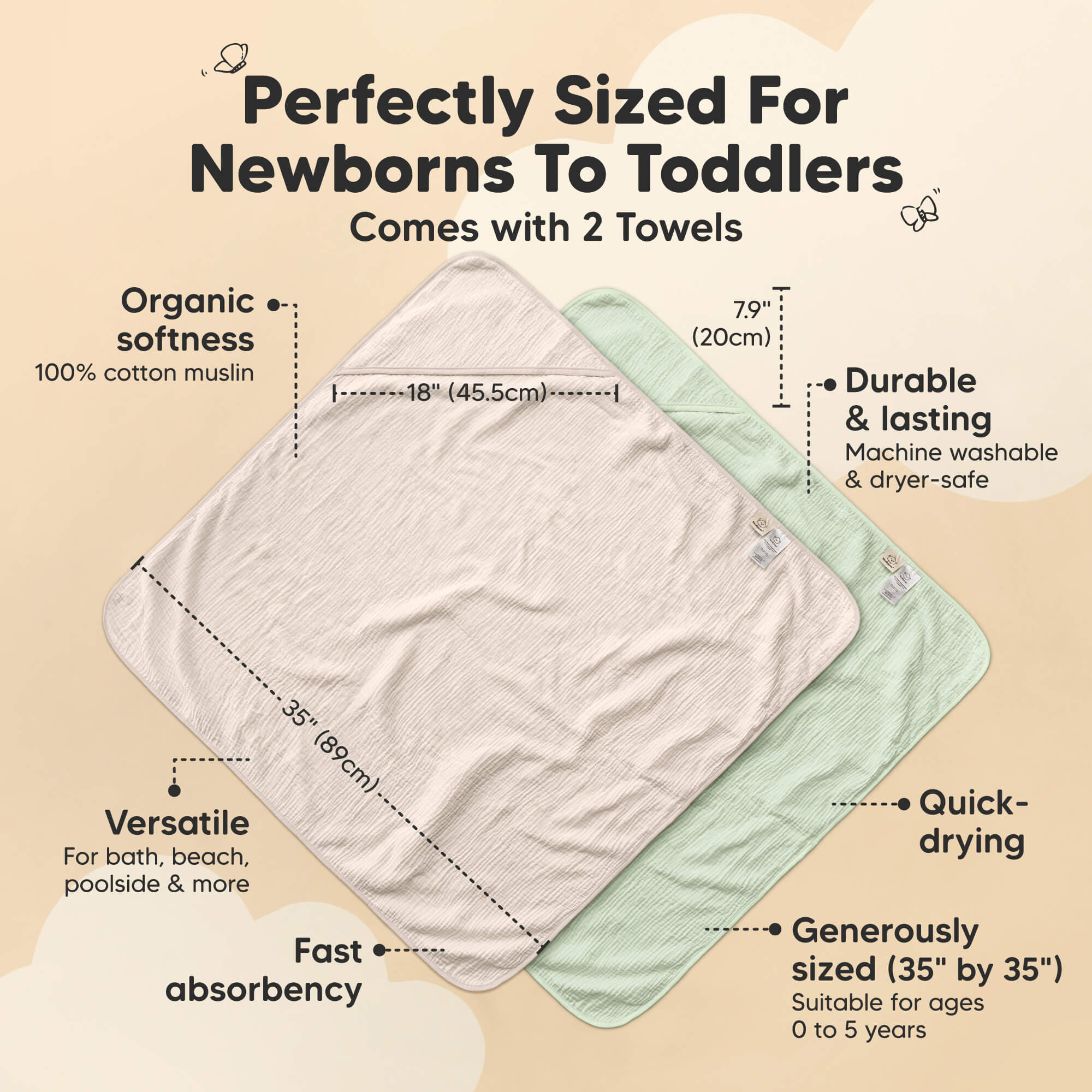 • 100% organic muslin cotton baby hooded towel. Soft, breathable, and gentle on skin