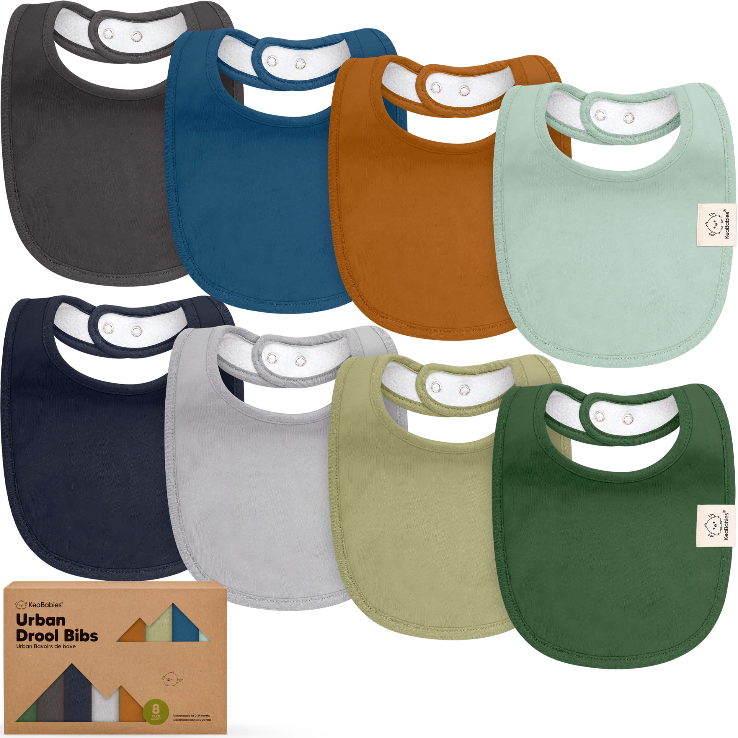 - 8-Pack modern and stylish bibs.